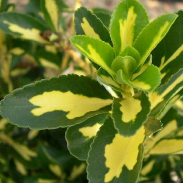 Dekoratív, sárgás tarka levelű örökzöld bokor.