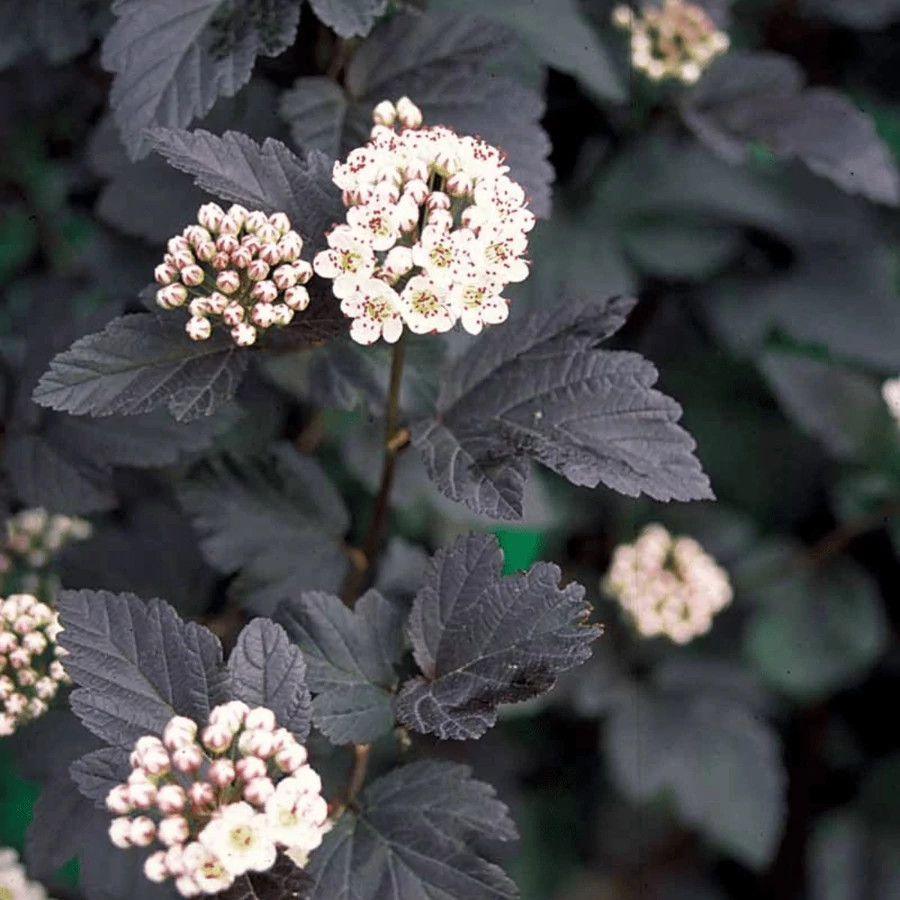 Sötétbordó levelű, fehér virágú díszcserje, kontrasztos megjelenéssel.